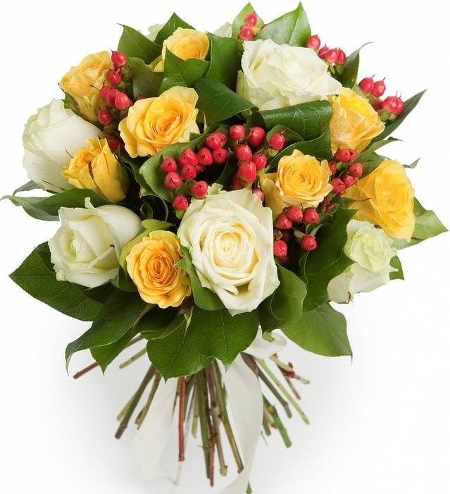Получить в подарок такой красивый букет мечтает каждый человек с тягой к прекрасному. Желтые розы означают веселье, позитив и расположение, а белые – нежность, невинность, изысканность и чистоту намерений. Гиперикум, дополняющий композицию, отлично вписывается в общую картину, делая букет еще насыщеннее. Цветы подойдут любимой, друзьям или коллегам, по поводу и без.