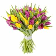Букет из множества ярких тюльпанов – прекрасный способ выразить своё расположение и подарить шикарное настроение возлюбленной, близким друзьям или коллеге по работе. Цветы подойдут для праздника, извинения или просто в виде приятного ненавязчивого жеста, дарящего приподнятое настроение. Фиолетовый цвет покажет уважение и преданность, а желтый принесет лучики солнца в жизнь близкого человека.